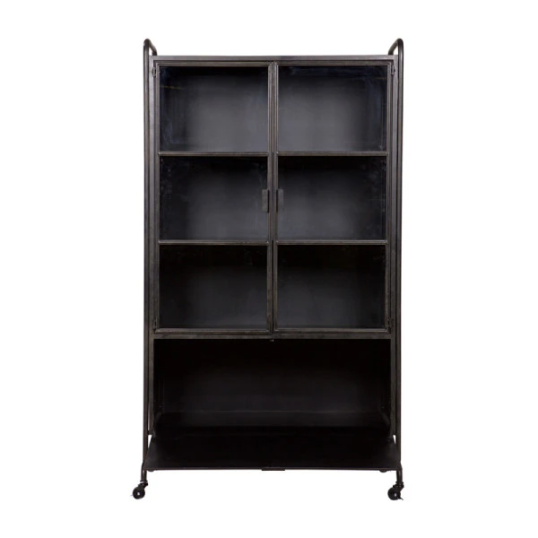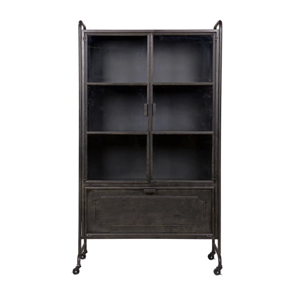 De vitrinekast BePureHome Steel doet het fantastisch in een vintage interieur, maar gaat ook erg goed samen met industriële meubels van metaal. Zet je mooiste beeldjes, fotolijsten of wijnglazen achter de glazen raampjes en geniet van het contrast tussen de kleuren van je accessoires en de zwarte ombouw van de kast! De wielen zorgen voor een speels accent in het geheel.