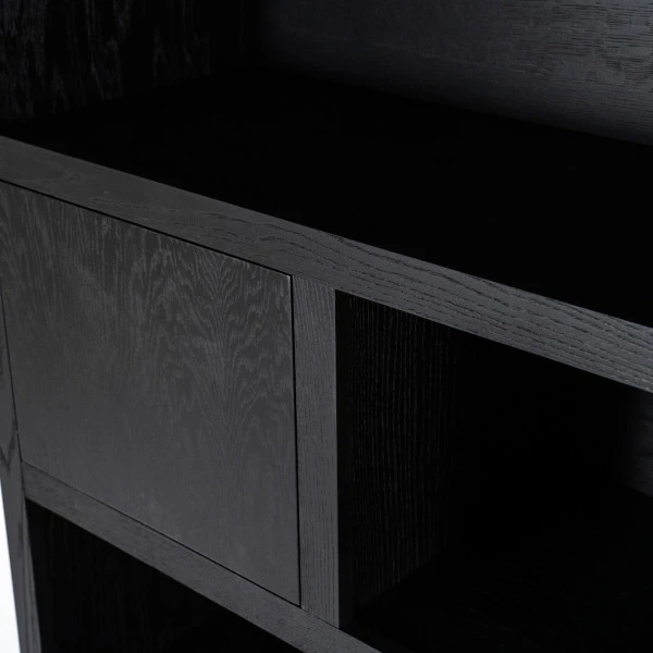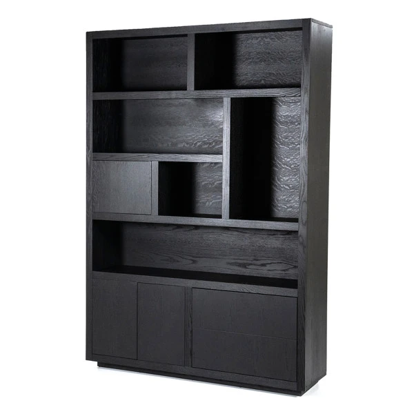 In deze Eleonora Helsinik boekenkast van zwart eiken komen de kleurrijke kaften van je boeken geweldig tot recht! Wissel de boeken af met foto’s of mooi decoraties: zo versterk je het speelse design van deze bijzondere boekenkast. Met een breedte van 150 cm biedt de boekenkast zelfs nog ruimte voor spulletjes die je liever uit het zicht bewaard, achter de deuren en in de lades.