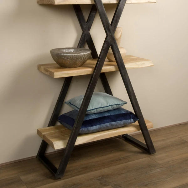 De Tower Living Xabia serie valt op dankzij het X-vormige onderstel of frame van donker gelakt staal. Maar ook de boomstam bladen van acacia springen meteen in het oog! Combineer de stellingkast met een mooie boomstamtafel. Ook een van hout en staal vind je in de serie.