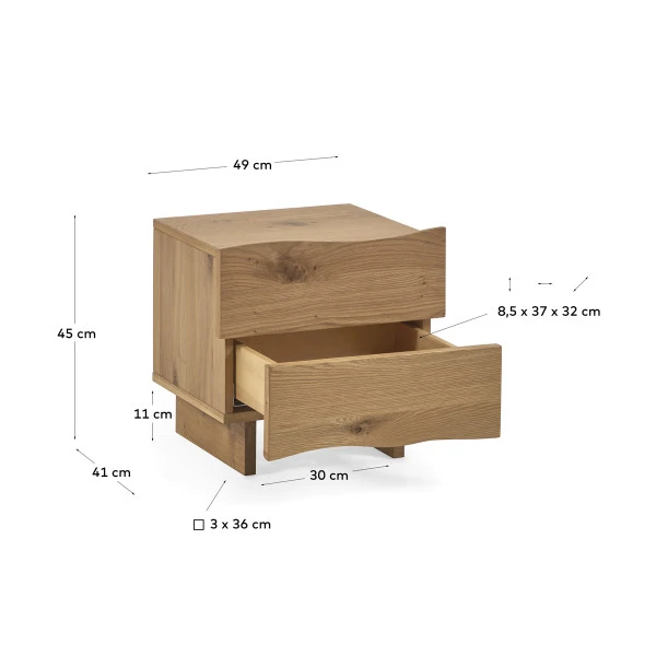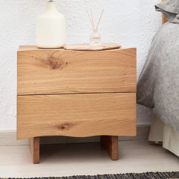 Wat dit Kave Home Rasha nachtkastje zo sfeervol maakt is niet alleen het warme, natuurlijke eiken; maar vooral ook de boomstam vormen in de lades. Alsof het nachtkastje zojuist in elkaar is gezet door de plaatselijke houtbewerker, van de eik uit je tuin! In de twee lades van het nachtkastje kun je bovendien alle boeken, crèmes en opladers wegbergen die anders altijd een rommeltje maken van je slaapomgeving.