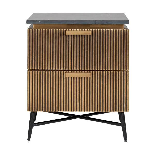 Wat de meubels uit de Richmond Interiors Ironville serie bijzonder maakt zijn de luxe materialen. Hout bekleed met metaalplaat zorgt voor een gouden gloed; een blad van echt marmer maakt de stijl compleet. Combineer het nachtkastje met een bijpassend dressoir of een wandkast met gouden ribbelmotief!