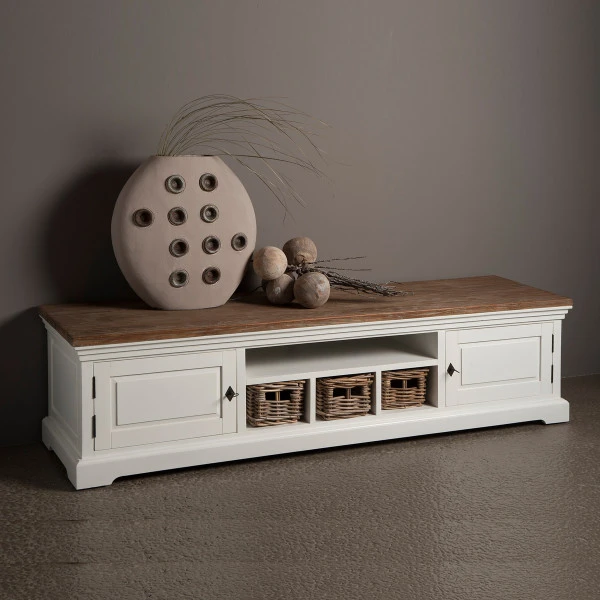 Op dit Tower Living Napoli tv meubel krijgt zelfs je moderne beeldscherm een landelijk karakter! Het witte hout zorgt voor een romantische look, terwijl de manden en het houten blad sfeer naar je woonkamer brengen. In het 180 cm brede tv-meubel is bovendien heel wat plaats om spullen op te bergen: van apparatuur tot opladers en van spelletjes tot fotoalbums.