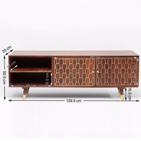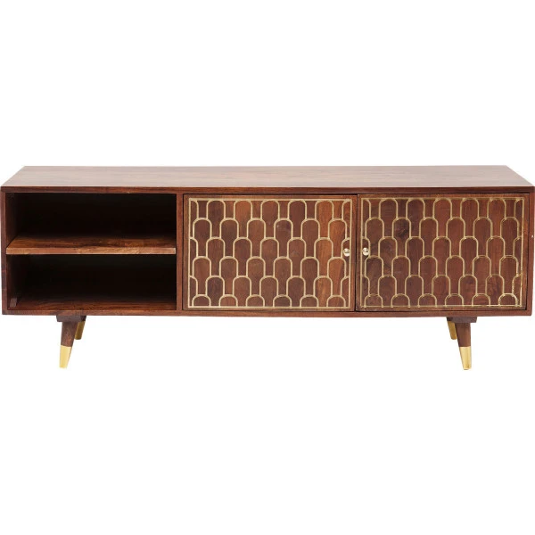 Dit elegante meubel is een knipoog naar de 60s, geheel in de stijl van nu. Door het massieve mangohout voorzien van goudkleurige accenten is dit tv-meubel een echte eye-catcher. Met twee open vakken en opbergruimte achter de twee deurtjes voldoet het meubel ook aan de functionele eisen. De warme tinten van het gelakte mangohout maken dit meubel een bijzonder welkome aanwinst in uw interieur.