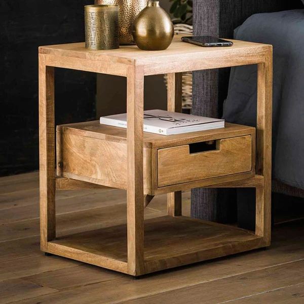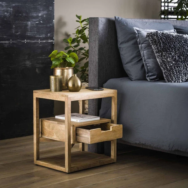Dit massief mangohouten nachtkastje maakt je slaapkamer in één klap gezellig. Bovendien is het design van het nachtkastje bijzonder, met een lade die steunt op een kruispoot van hout. Berg nachtcrèmes en oordopjes netjes weg in de lade; het nachtkastje biedt daarnaast nog ruimte voor een stapel tijdschriften en je leesboek. Bovenop het houten blad komt je leeslamp extra mooi uit!