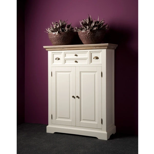 De Tower Living Fleur meidenkast past erg mooi in een landelijke woonstijl met romantische invloeden. Het grenenhout is in de basis wit, maar een vergrijsd houten bovenblad zorgt voor een sfeervol contrast. Met een omvang van 100 bij 128 centimeter, twee deuren en vier lades kun je in deze meidenkast heel wat rommeltjes kwijt! Op het bovenblad van hout is plaats voor een mooie decoratie.