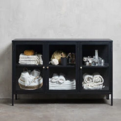 Dit metalen dressoir past heel mooi in een modern industriële woonstijl. De strakke lijnen zorgen voor een design look, en de gouden handgrepen vormen een chique detail. Achter de 3 deuren is plaats voor serviesgoed, boeken, spelletjes, kunst, souvenirs of andere fijne spulletjes! In het zwart metalen dressoir komt elke kleur boekenkaft of vaas extra mooi uit.