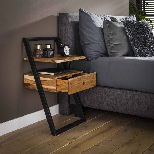Een sfeervol nachtkastje met een industrieel design: daar wordt je slaapkamer gezelliger én mooier van! Het nachtkastje is gemaakt van massief acaciahout met een matte, beschermende coating. Een stoer onderstel van robuust metaal geeft het nachtkastje haar industriële uitstraling. Met een plankje, open vak en lade biedt het nachtkastje veel ruimte voor je spulletjes.