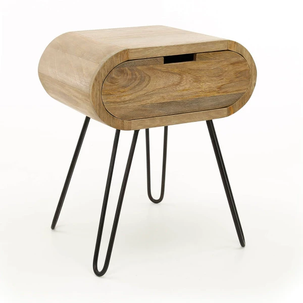Dit nachtkastje van mango hout brengt bijzonder veel sfeer naar je slaapkamer. Tegelijkertijd zorgen de ronde hoeken en uitslaande, slanke poten voor een speels effect! Het nachtkastje is voorzien van een ruime lade waarin je nachtcrèmes, oordoppen en je telefoon kunt opbergen. Bovenop het blok van mango hout is dan nog plaats voor je leesboek en een nachtlampje!