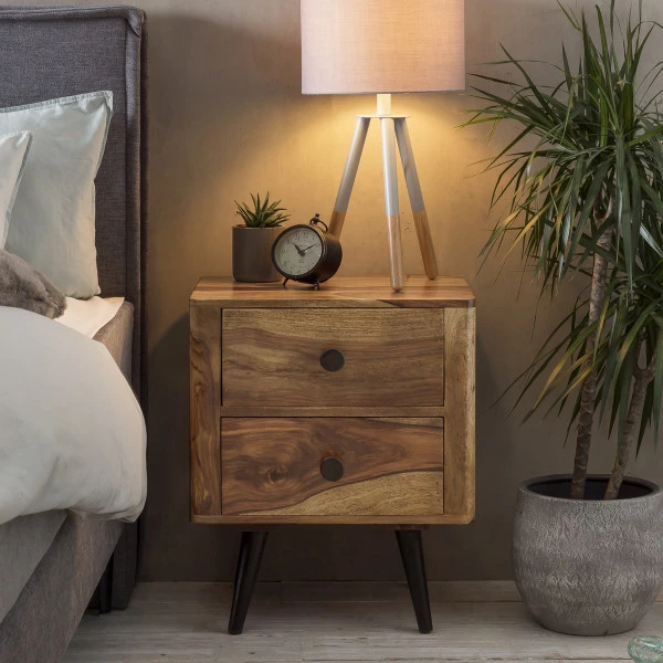 Met dit nachtkastje van sheeshamhout naast je bed krijgt je slaapkamer meteen een gezellige sfeer. Elegante pootjes van metaal zorgen voor een speels effect. Berg tijdschriften, je leesboek en je telefoon op in de twee lades zodat je met een opgeruimd gevoel gaat slapen! Op het 50 centimeter brede nachtkastje is plaats voor een gezellige leeslamp en een glas water.