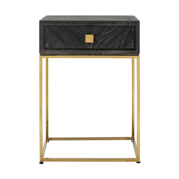 Het Richmond Interiors Blackbone nachtkastje is gemaakt van zwart eikenfineer met een subtiel visgraat patroon. Daaronder pronken poten van zilver of goud roestvrij staal. Welke is jouw favoriet? Het nachtkastje heeft een mooi slank design waardoor het voor het oog weinig plaats in neemt. Berg nachtcrème, oordopjes en je boek netjes weg in de lade voor een opgeruimde slaapomgeving!