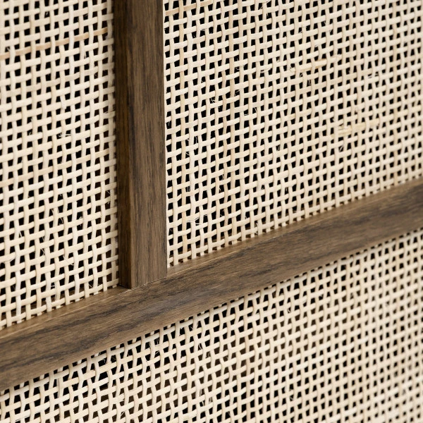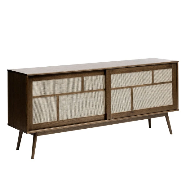 Een retro dressoir dat je kamer opvrolijkt! Het dressoir staat op speelse poten en heeft twee schuifdeuren met een asymmetrisch patroon van rotan vlakken. Wat betreft het hout heb je keuze uit twee kleuren: naturel of walnoot. Met een breedte van 180 centimeter kun je in dit dressoir heel wat serviesgoed kwijt! Of gebruik het voor boeken, manden met rommeltjes en spelletjes.