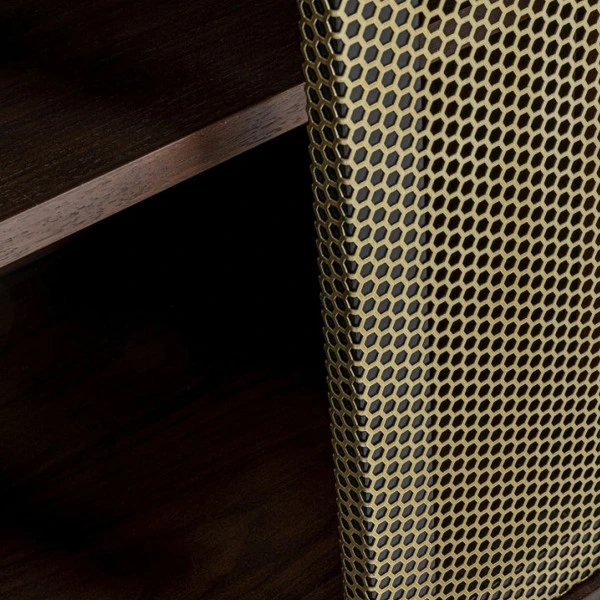 Het Kare Design Arizona dressoir heeft een chique, retro uitstraling. De mix van walnoot en messing zorgt bovendien voor een warm geheel! Let vooral ook op de details van dit dressoir, een visgraatpatroon in het walnootfineer en een honingraat schuifdeur van messing.