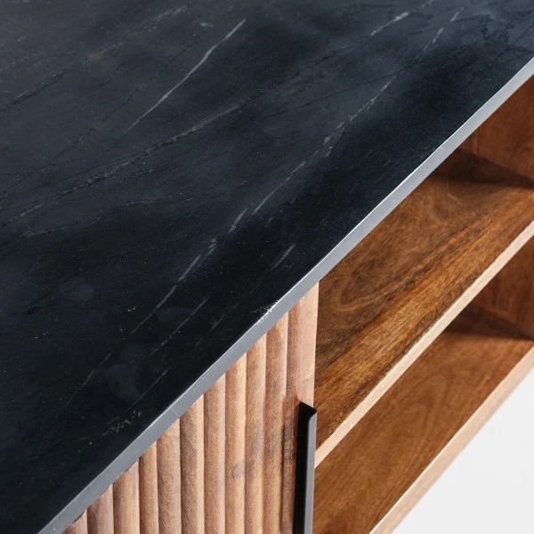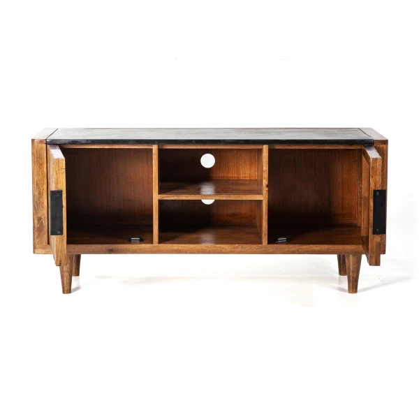 Dit Eleonora Carter tv-meubel van 125 cm breed is heerlijk compact. Toch zorgt het voor veel sfeer in je zithoek! Het mangohout is geolied en vormt een prachtig geheel met het blad van zwart marmer. Speelse pootjes maken de retro look compleet. Zet je apparatuur in de open vakken en berg rommel netjes weg achter de twee deuren van mangohout.