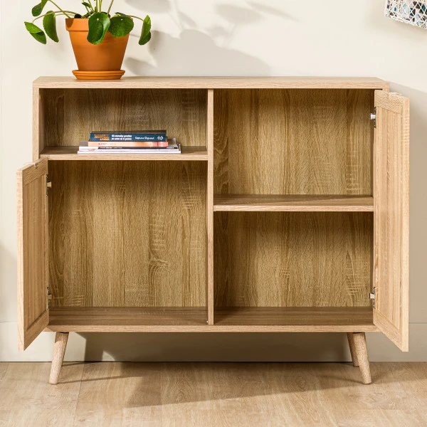 Deze wandkast is klein van formaat, en toch een echte sfeermaker. Dat komt door de natuurlijke uitstraling, maar ook door het asymmetrische design met een kleine en een grote deur. Boven de kleinste deur biedt een open vak plaats aan stapels boeken of een gezellige decoratie! Administratie en rommeltjes kun je netjes wegbergen achter de twee deuren.