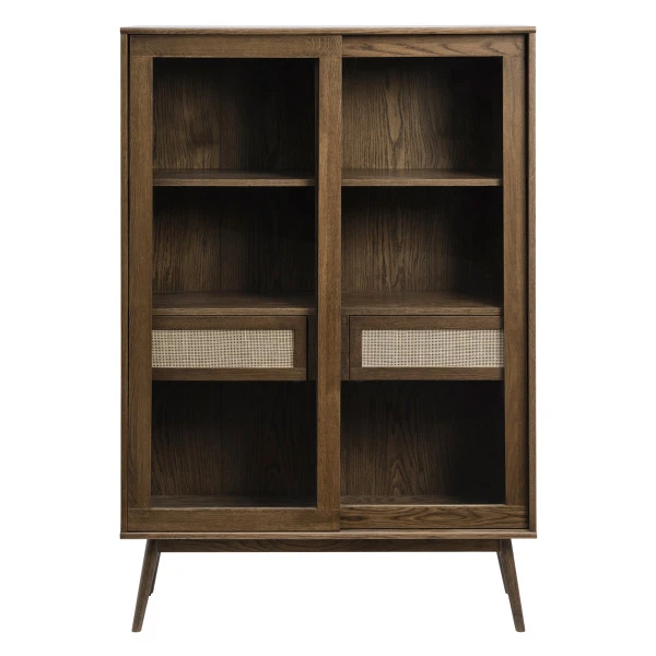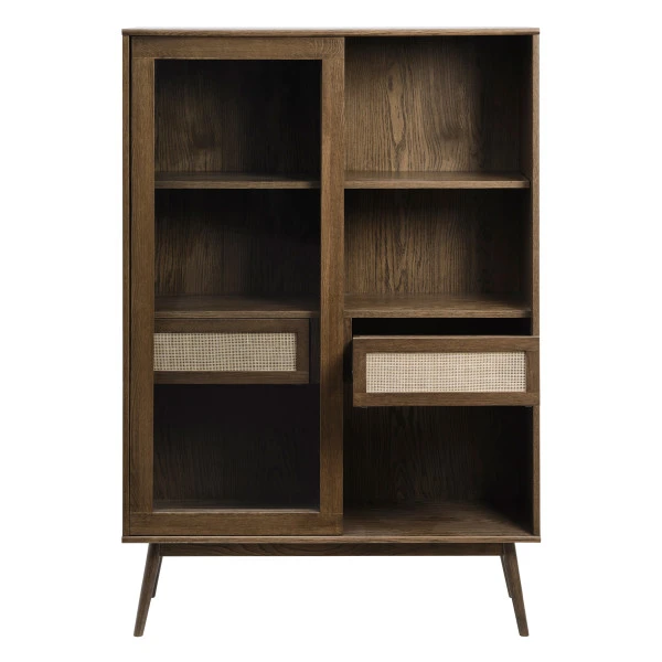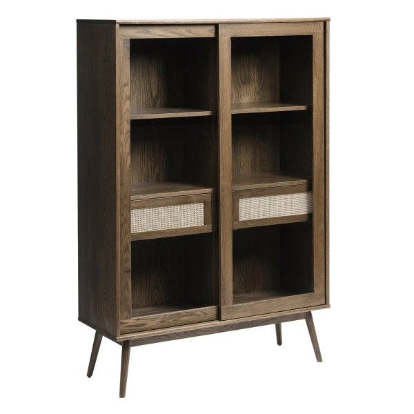 Een compacte wandkast met een retro uitstraling. De wandkast van 110 bij 160 centimeter neemt een bescheiden plaats in, maar zorgt wel voor veel sfeer! Bovendien kun je er heel wat serviesgoed, boeken of souvenirs in kwijt. Leuk detail: achter de glazen deuren zie je twee houten lades met rotan frontjes. Wat betreft het hout heb je keuze uit twee kleuren: naturel of walnoot.