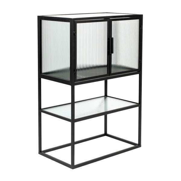 Je herkent de Dutchbone Boli serie aan de mix van zwart metaal en ribbelglas. Behalve deze compacte vitrinekast vind je in de serie ook een hoge wandkast, een ribbelglas dressoir en een klein wandkastje. Of zoek je nog een bijpassende salontafel?