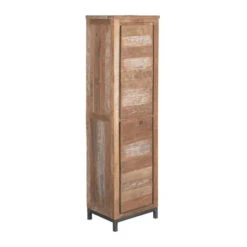 In deze smalle wandkast zie je de karakteristieke lijnen van het hout mooi terug, wat voor een natuurlijke sfeer in huis zorgt. Het teakhout is bovendien gerecycled zodat elk exemplaar volledig uniek is met subtiele variaties in de kleuren en lijnen van het hout. Een metalen onderstel zorgt voor een mooi contrast en een industrieel tintje!