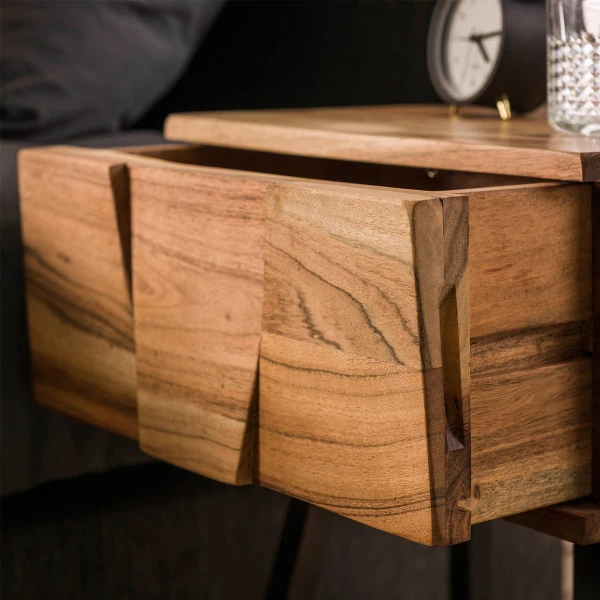 Dit acaciahouten nachtkastje heeft een speels design, met schuine poten en een bijzondere bewerking van de ladefront. Bovendien zorgt het naturel hout voor een warme sfeer in je slaapkamer. Het nachtkastje is bruikbaar aan beide kanten van het bed. In de ruime lade kun je alle rommeltjes opbergen die anders je slaapomgeving onrustig zouden maken: opladers, nachtcrèmes, tijdschriften en boeken of je telefoon!