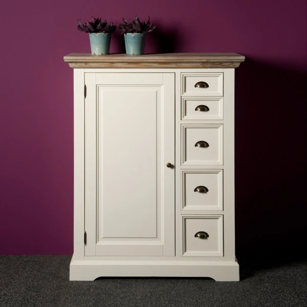 De Tower Living Fleur spekkast is gemaakt van wit grenenhout met een bovenblad in vergrijsd grenen, zodat een romantisch en landelijk geheel ontstaat. Achter de deur is plaats voor administratie, serviesgoed of spelletjes. En dan beschik je ook nog over vijf lades voor losse rommeltjes! Met een sfeervol kaarsenplateau op het blad van hout maak je de landelijke spekkast helemaal compleet.