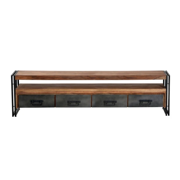 Een stijlvol tv-meubel van hout en metaal: het schoolvoorbeeld van industrieel design. Vooral het schrootmetaal draagt bij aan het robuuste uiterlijk van het tv-meubel, terwijl de strakke lijnen deze erg geschikt maakt voor gebruik in een modern interieur. Voor je apparatuur is ruim plaats in het open vak en snoeren werk je eenvoudig weg aan de achterzijde. Berg films en opladers weg in de lades voor een gezellige zithoek!