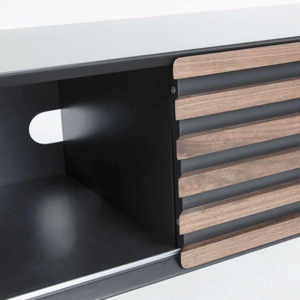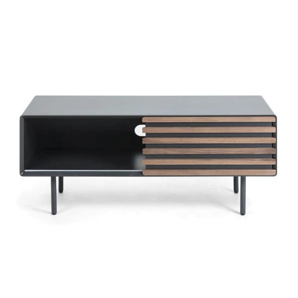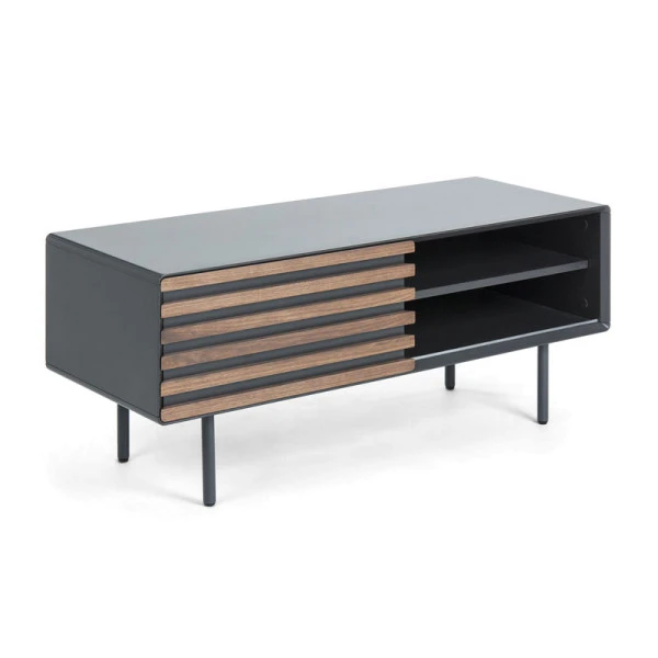 Voor dit Kave Home Kesia tv-meubel van 120 centimeter breed heb je altijd wel plaats in de zithoek. Zet je apparatuur in het tv-meubel en bepaal per moment aan welke kant je de schuifdeur wil plaatsen. Bijzonder aan het mat grijs tv-meubel is de mix van modern en retro. Het design is strak, maar de afgeronde hoeken en stroken van walnoot zorgen juist voor een speels accent!