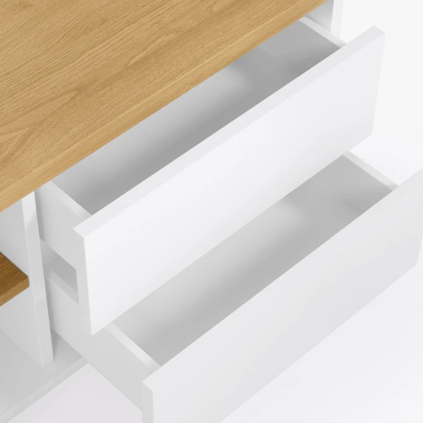 De meubels uit de Kave Home Abilen serie passen perfect in een Scandinavisch design interieur, of in een modern interieur waaraan je graag de sfeer van eiken toevoegt. Dit wit met eiken tv-meubel is verkrijgbaar met een breedte van 150 of 200 cm.