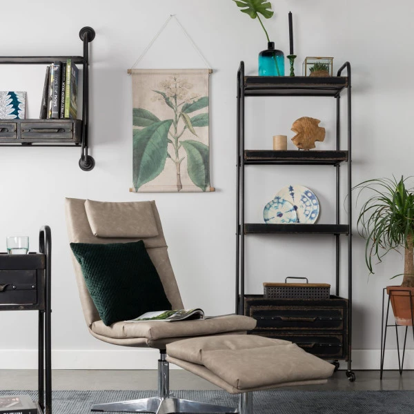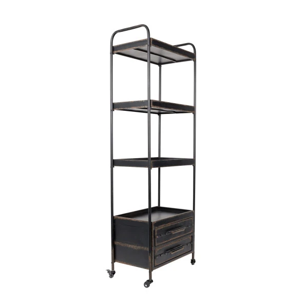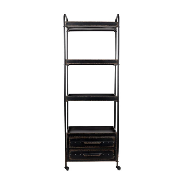 Een verrijdbaar metalen rek dat een vintage look naar je interieur brengt: daar zorgt de subtiele roestafwerking wel voor. Het rek is met 175 centimeter hoog te noemen en biedt zo veel plaats aan decoraties, boeken, serviesgoed of plantjes! Die kun je allemaal kwijt op 4 ruime planken, terwijl in de 2 lades plaats is voor losse rommeltjes om je woonkamer netjes opgeruimd te houden.