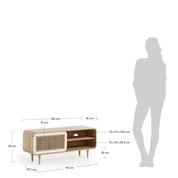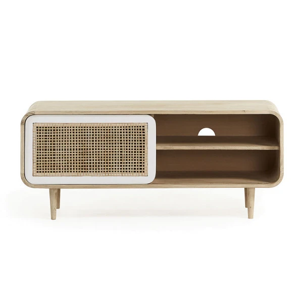 Het mango houten Kave Home Georg (Gerald) tv-meubel heeft een heerlijke retro look, met zijn afgeronde hoeken en speelse pootjes! Ook de rieten schuifdeur past helemaal in de retro woonstijl. Met een breedte van 120 centimeter biedt het tv-meubel aardig wat opbergruimte. In de open vakken kun je apparatuur neerzetten. Vul de andere zijde met leuke decoraties en bepaal met behulp van de schuifdeur zelf wat in het zicht staat!