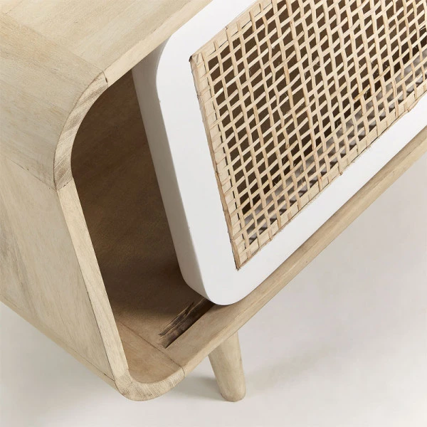 Je herkent de Kave Home Georg (Gerald) serie aan de mango houten basis en een retro design. De meeste meubels in de serie hebben dezelfde rieten deur. Kijk gauw verder voor een kabinet of dressoir om met je tv-meubel te combineren!