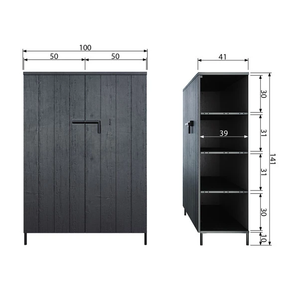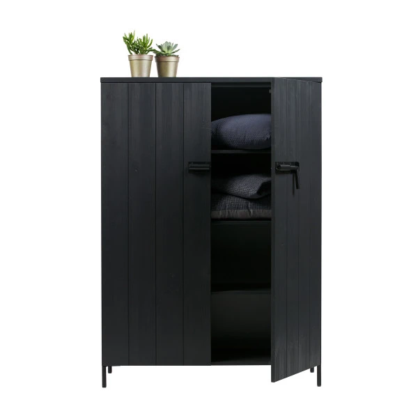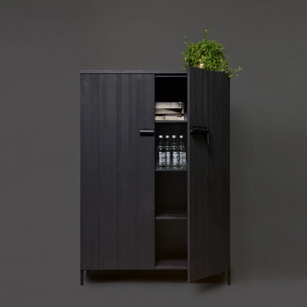 Je kunt de Woood Bruut wandkast voor allerlei doeleinden gebruiken. Voor linnen bijvoorbeeld, op de overloop of slaapkamer. Of zet de zwarte houten wandkast juist vol in het zicht in de woonkamer en berg er allerlei losse rommeltjes in op: voortaan ziet je woonkamer er netjes opgeruimd uit! Ook handig voor serviesgoed in de eetkamer.