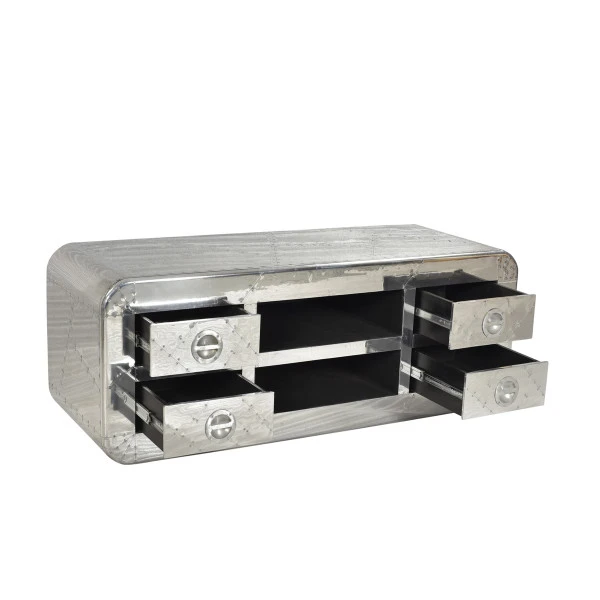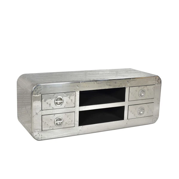 Dit tv-meubel geeft je woonkamer een fantastische retro look, zeker wanneer je een stoere spotlamp op het meubel schijnt. Het aluminium is met de hand beslagen voor een nostalgische look die doet denken aan de eerste vliegtuigen, met passie vervaardigd. Een combinatie van retro met industrieel, waardoor dit 145 cm brede tv- meubel in vele woonstijlen mooi staat!