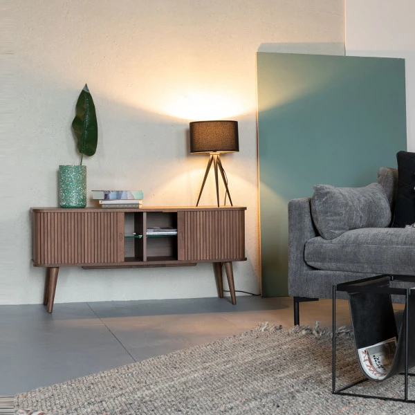 Met dit Zuiver Barbier Walnut tv-dressoir staat je apparatuur netjes uit zicht; als je televisie gaat kijken kun je naar wens de roldeuren een stukje open zetten! Met een breedte van 120 centimeter past het tv-meubel in de meeste zithoeken. Twee glazen planken achter de walnoot roldeuren maken de retro look compleet. Maar het dressoir is natuurlijk ook geschikt voor het opbergen van serviesgoed of boeken!