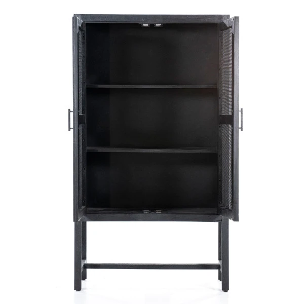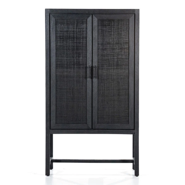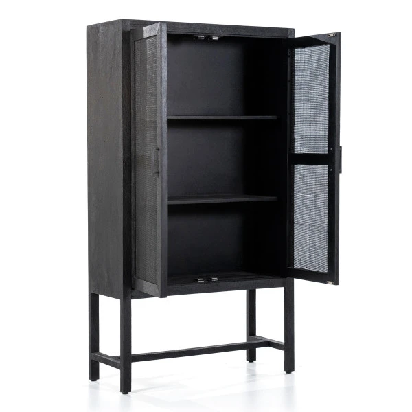 De Eleonora Vic kast met rotan webbing vormt een gezellige toevoeging aan je moderne interieur. Bovendien biedt de zwarte kast van 90 bij 160 centimeter veel opbergruimte. Zet er serviesgoed in, of gebruik de kast in de woonkamer voor spelletjes en boeken! Achter de deuren met rotan webbing zie je de vormen van je servies of boeken nog subtiel terug.