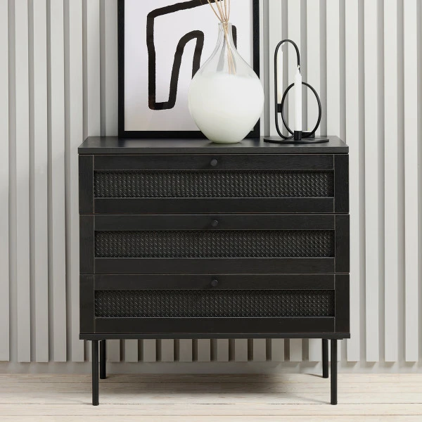 Dit wandkastje is helemaal zwart, met details van rotan voor een speels en sfeervol effect. In de drie ruime lades kun je veel spulletjes kwijt, die anders je woonkamer zo ongezellig maken. Van opladers, post en pennen tot tijdschriften en spelletjes! Zet een mooie decoratie bovenop zoals een plant of kunstwerk: bij het zwart van het wandkastje komen alle kleuren extra mooi uit.